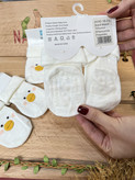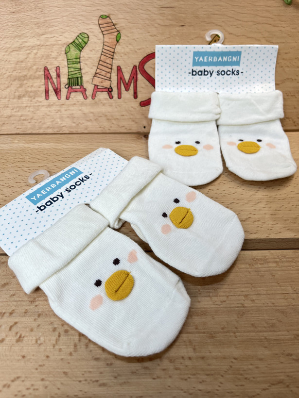 یه جوراب سبک و لطیف برای نوزادان ۰ تا ۹ ماه، با طراحی اردک کوچولوی مهربون روی زمینه سفید کرمی.