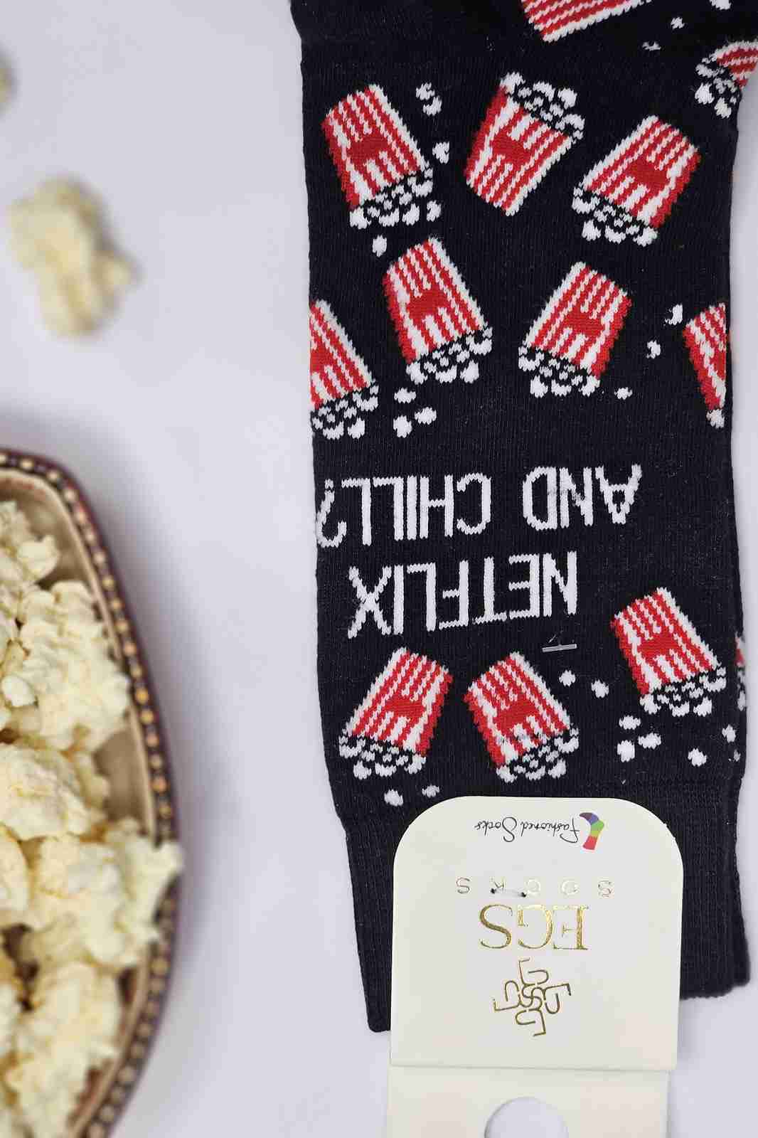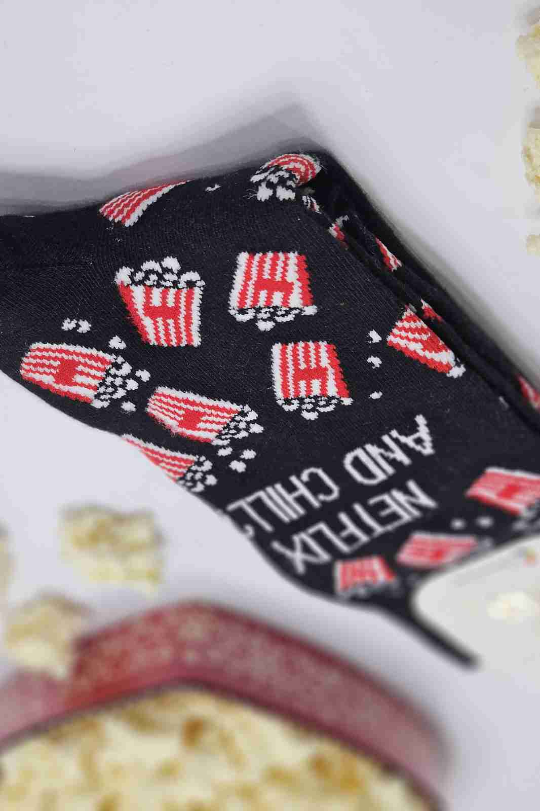 جوراب مشکی طرح پاپ‌کورن با نوشته Netflix & Chill – عکس از زاویه بغل