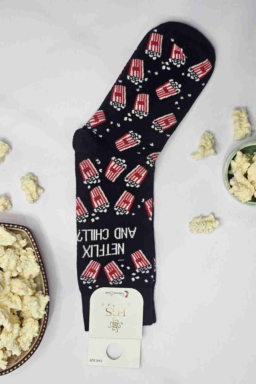 جوراب فانتزی مشکی طرح پاپ‌کورن و نوشته Netflix & Chill – نمای اصلی