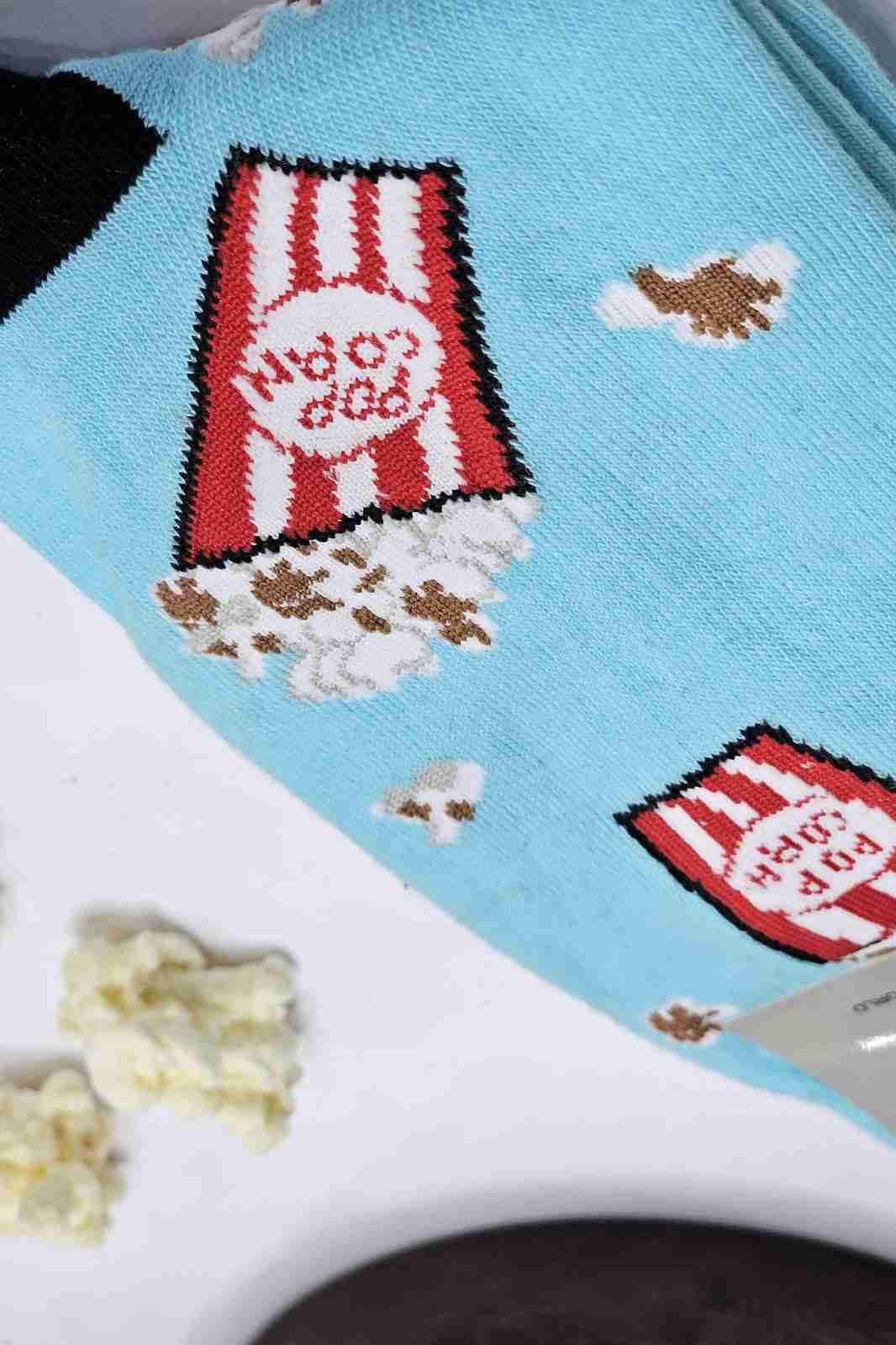 نمای نزدیک طرح پاپ‌کورن روی جوراب آبی
