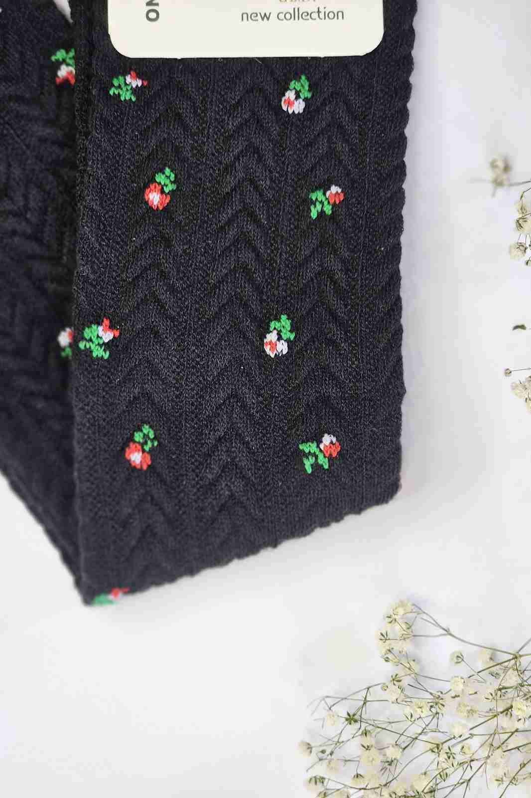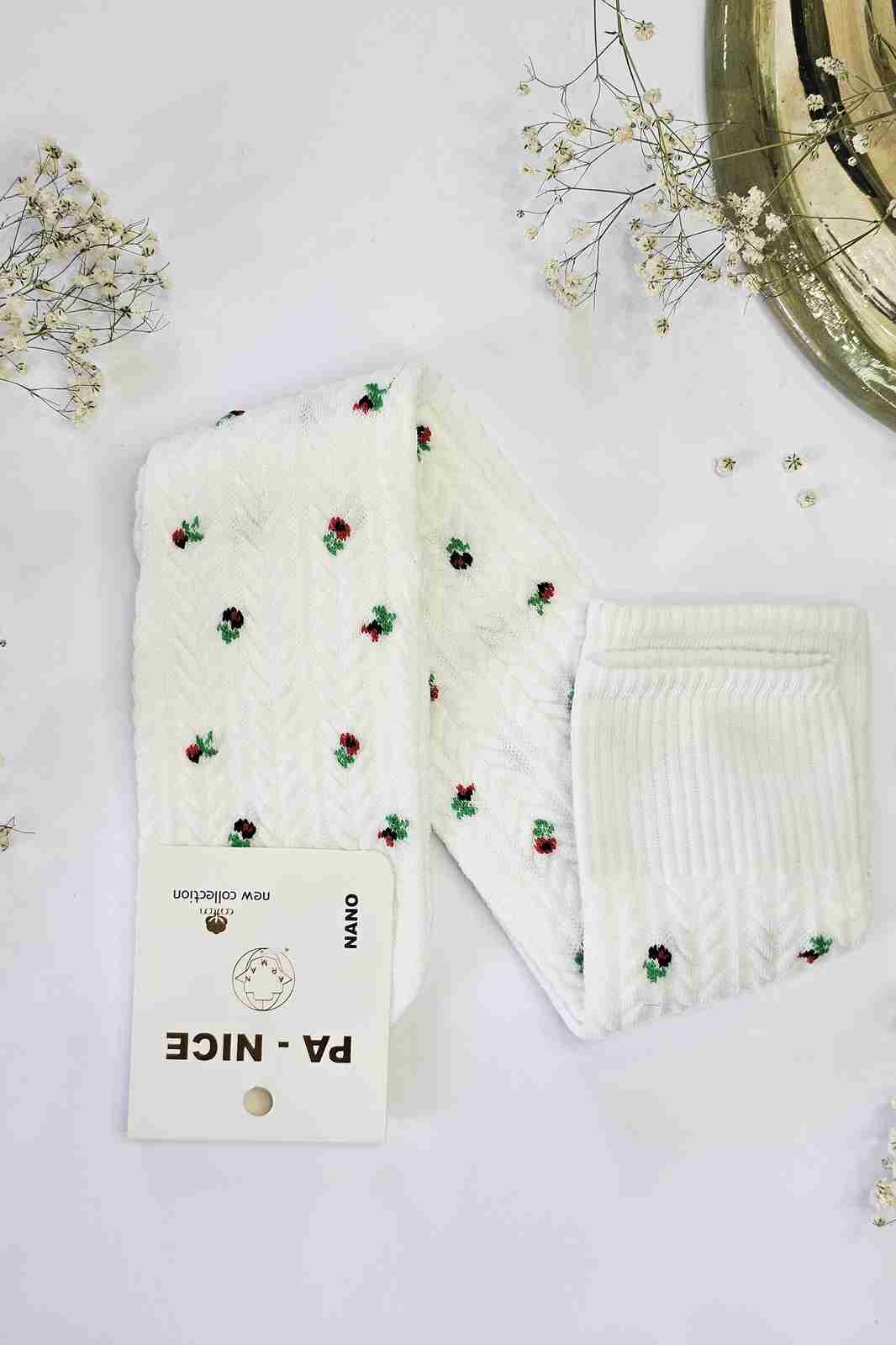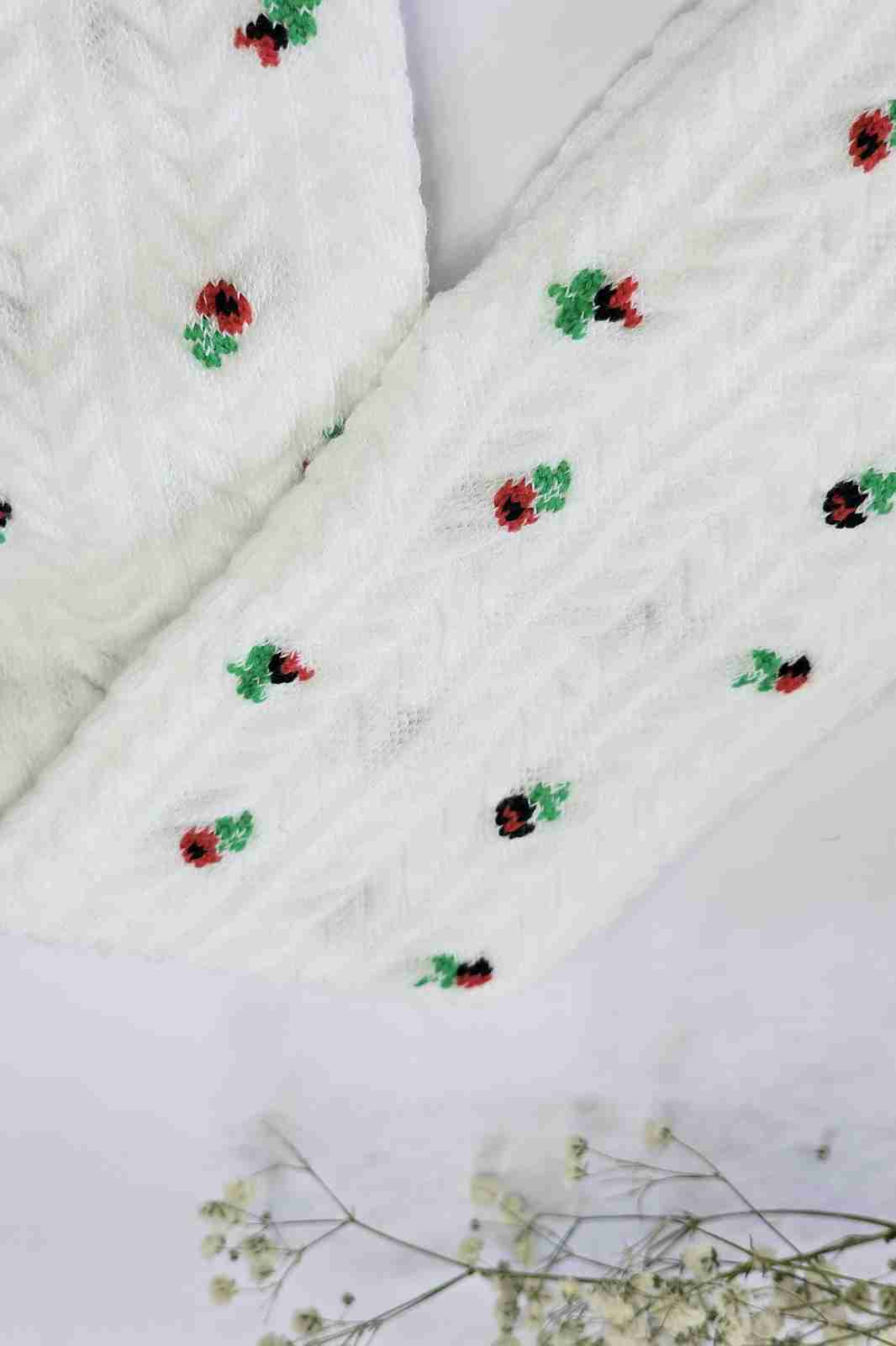نمای نزدیک بافت گندمی و گل‌های ریز جوراب کودک