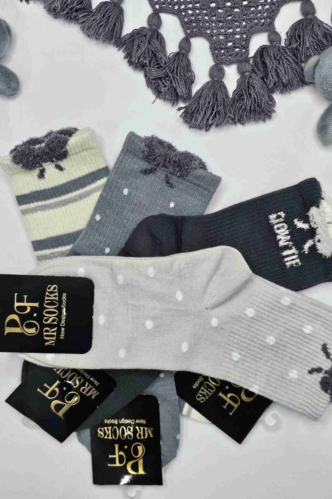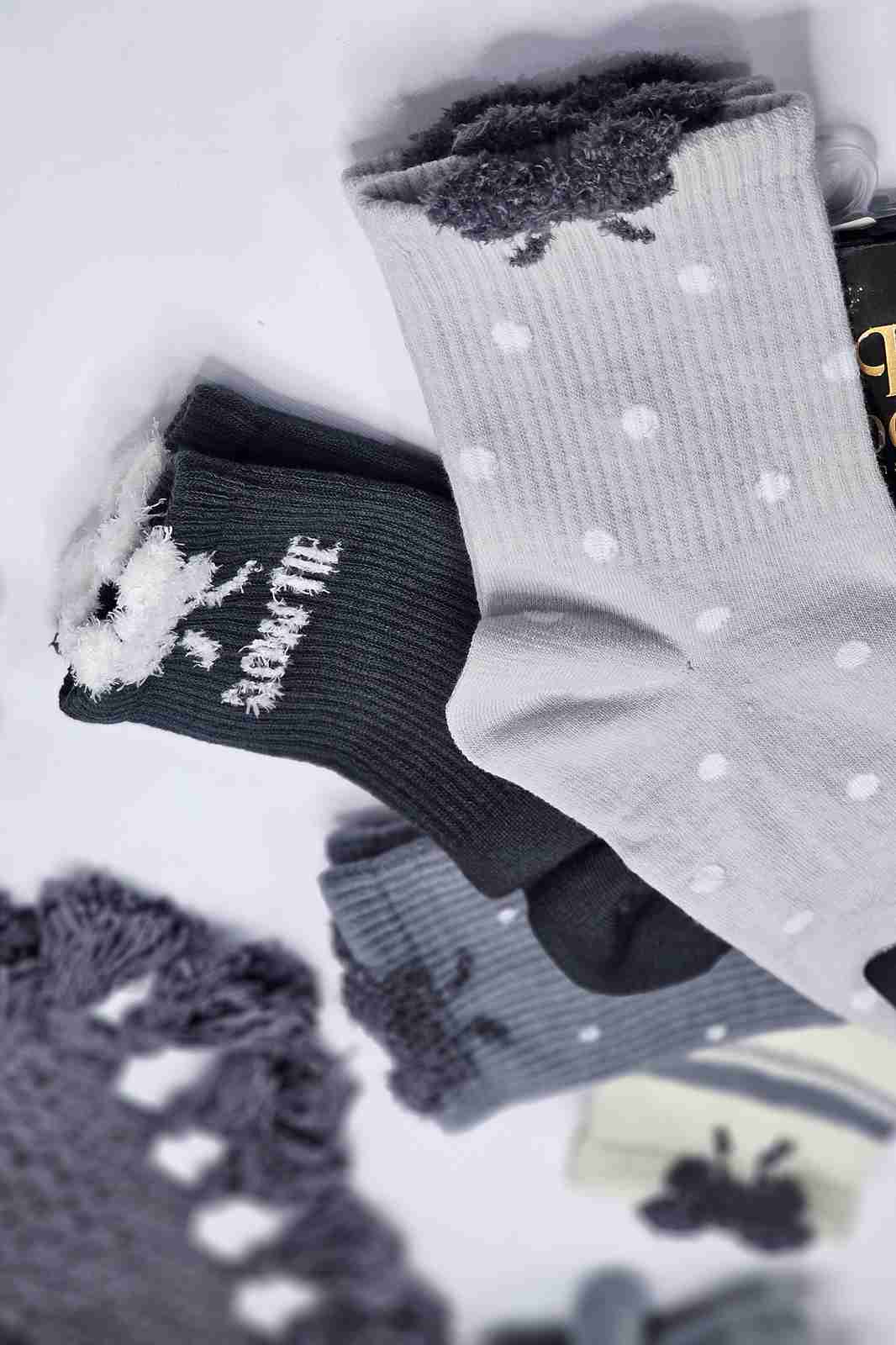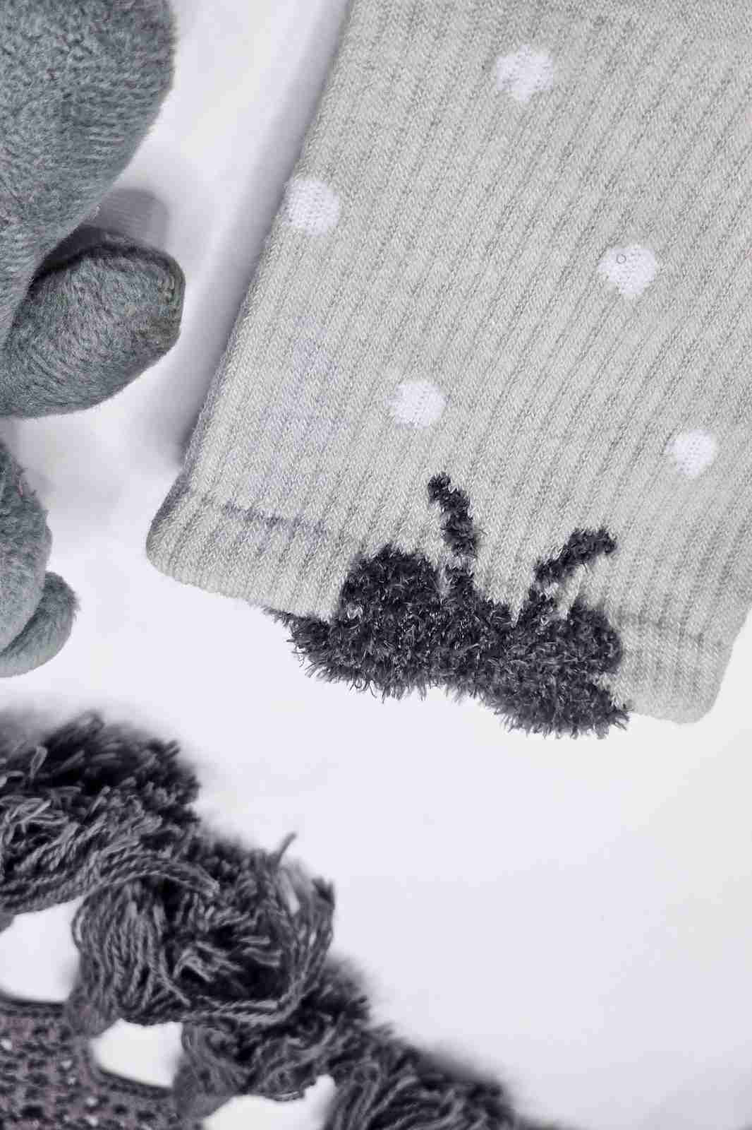 این مجموعه شامل چند مدل فوقالعادهست - جوراب راهراه کرم و خاکستری با لبه موهر پرپشت، خالخالی طوسی با نقاط سفید، سفید با خال طوسی و خاکستری تیره که هر کدوم یه شخصیت خاص و دلنشین دارن! 🤍🖤
