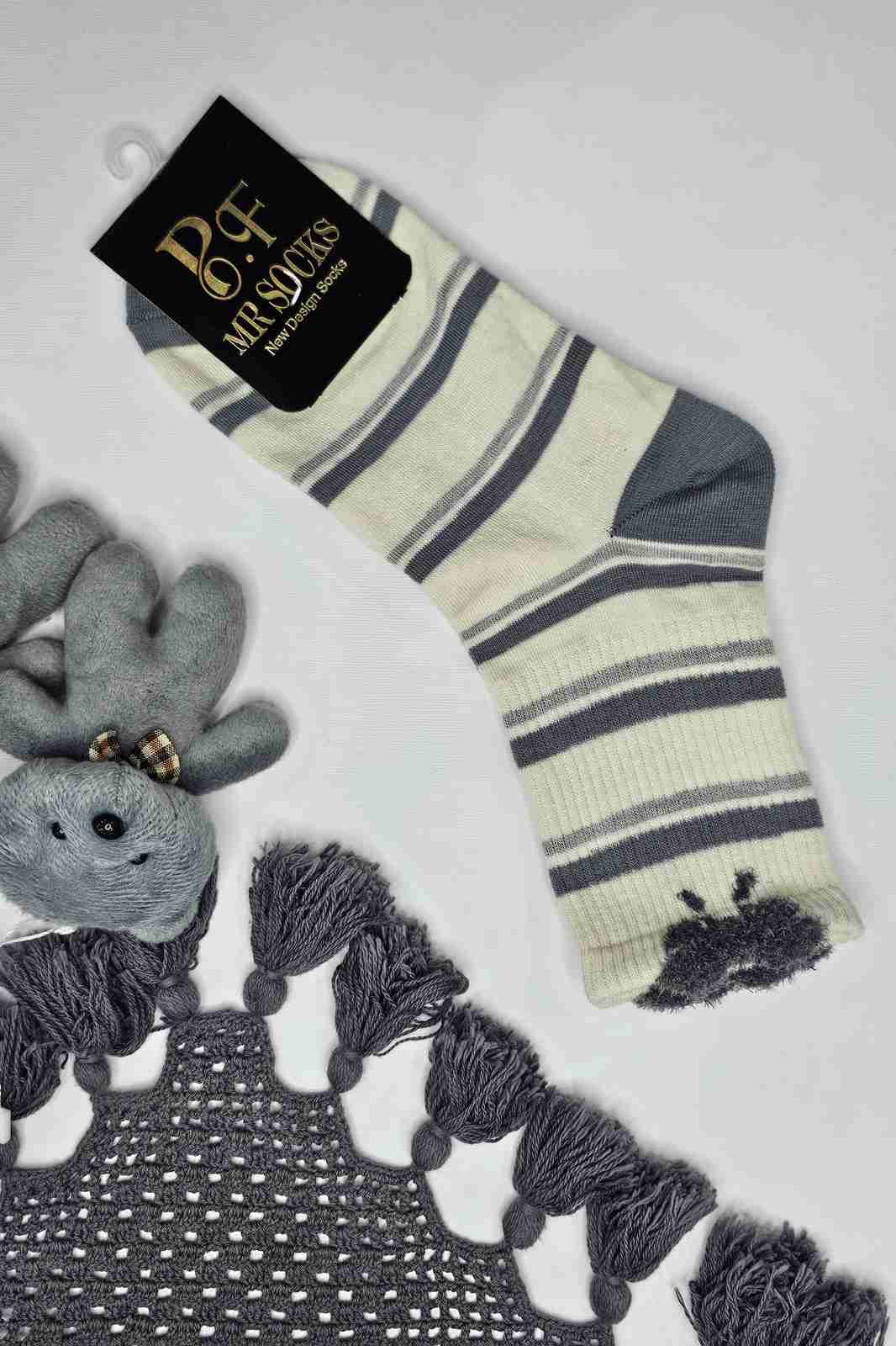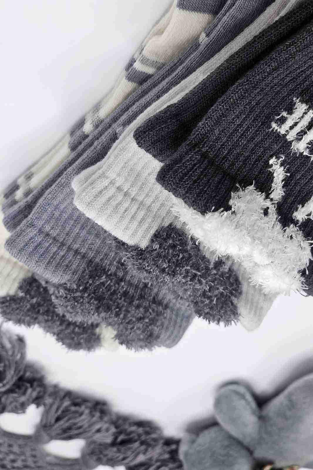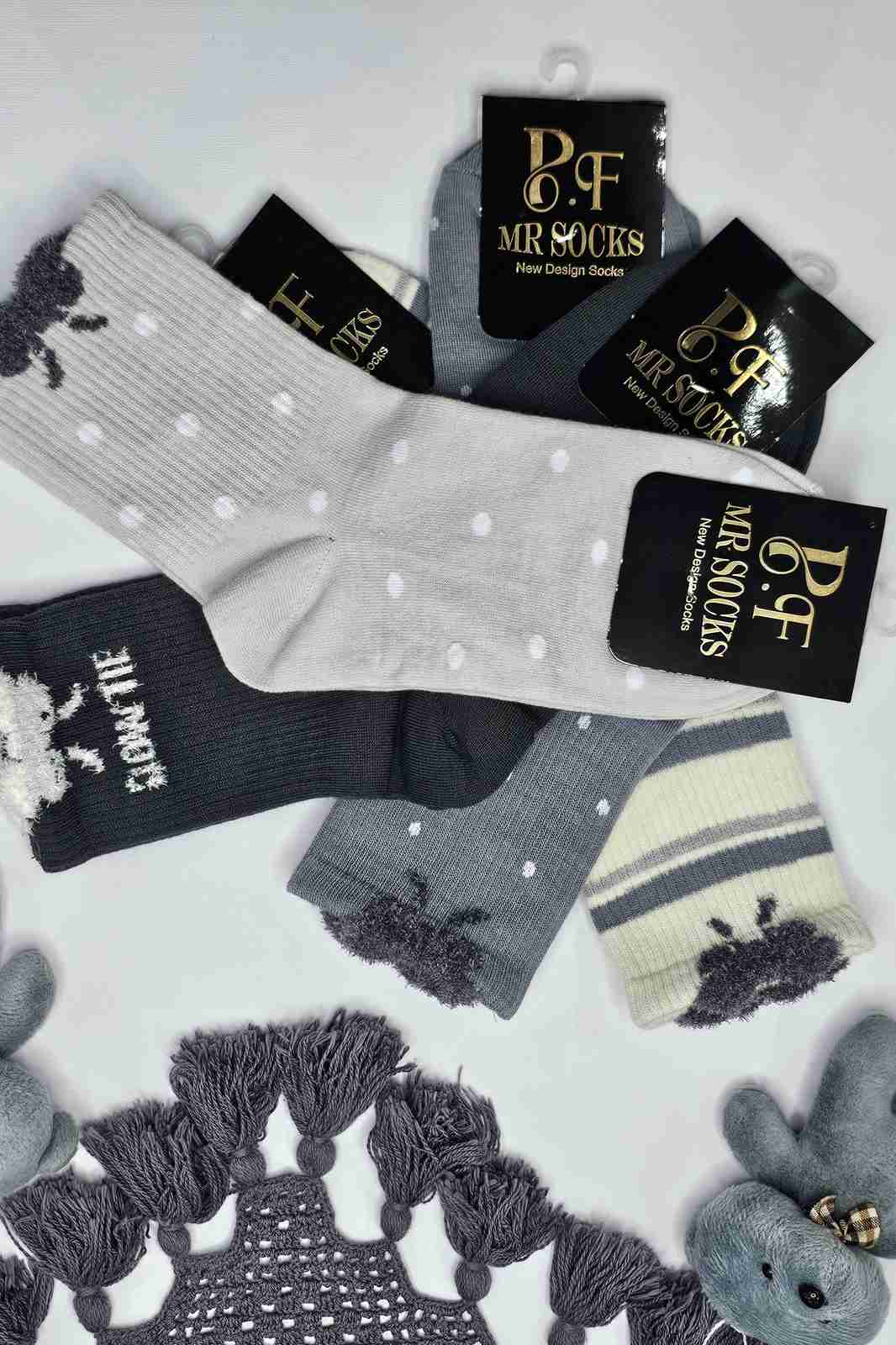 این مجموعه شامل چند مدل فوقالعادهست - جوراب راهراه کرم و خاکستری با لبه موهر پرپشت، خالخالی طوسی با نقاط سفید، سفید با خال طوسی و خاکستری تیره که هر کدوم یه شخصیت خاص و دلنشین دارن! 🤍🖤