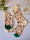 این جوراب ساق بلند با طرح شاد و رنگارنگ از شخصیتهای کارتونی در حال بازی و گلهای متنوع، حس زندگی و انرژی مثبت را به استایل شما میآورد. زمینه کرم در کنار طرحهای سرخ، زرد، نارنجی و سبز، جلوهای گرم و پرنشاط ایجاد کرده است. قسمت پنجه و پاشنه به رنگ سبز تیره طراحی شده تا علاوه بر زیبایی، دوام بیشتری به جوراب بدهد. این مدل انتخابی عالی برای افرادی است که به جزئیات فانتزی در استایل روزانه خود اهمیت میدهند.