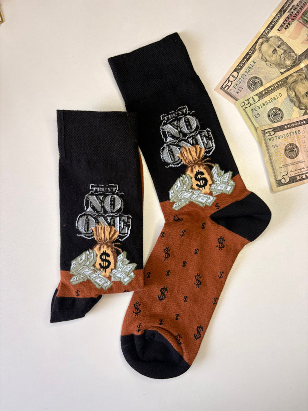 این جوراب ساق بلند با طراحی منحصربهفرد کیسه پول، دلار و نوشتهی Trust No One انتخابی عالی برای استایلهای خیابانی (Street Style) و اسپرت است. ترکیب رنگ مشکی و قهوهای در کنار نماد دلار، جلوهای خاص و متفاوت به این مدل داده است. مناسب افرادی که به استایل جسورانه و متفاوت علاقهمندند و میخواهند جزئیات پوشششان توجهها را جلب کند.