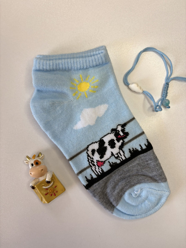 با این جورابهای شاد و تابستانی، مزرعهای پر از زندگی را به پاهایتان بیاورید! طراحی رنگارنگ شامل گاو سیاه و سفید خندان در حال چریدن، همراه با خورشید زرد درخشان، ابر پفکی و علفزار سبز، روی زمینه آبی آسمانی، حس یک روز آفتابی روستایی را القا میکند. جنس نرم و سبک پنبهای (۷۰% پنبه، ۳۰% الاستین)، ایدهآل برای روزهای گرم، بازی کودکان یا استایلهای کژوال خانوادگی. سایز استاندارد (۳۴-۳۹)، قابل شستشو در ماشین و مقاوم در برابر رنگپریدگی. همراه با دستبند آبی با آویز ابر و مهره فیروزهای، و مجسمه گاو کوچک با جعبه طلایی، این ست هدیهای دلپذیر برای بچهها و عاشقان طبیعت است – هر قدم، ماجرایی از مزرعه شاد را روایت میکند!