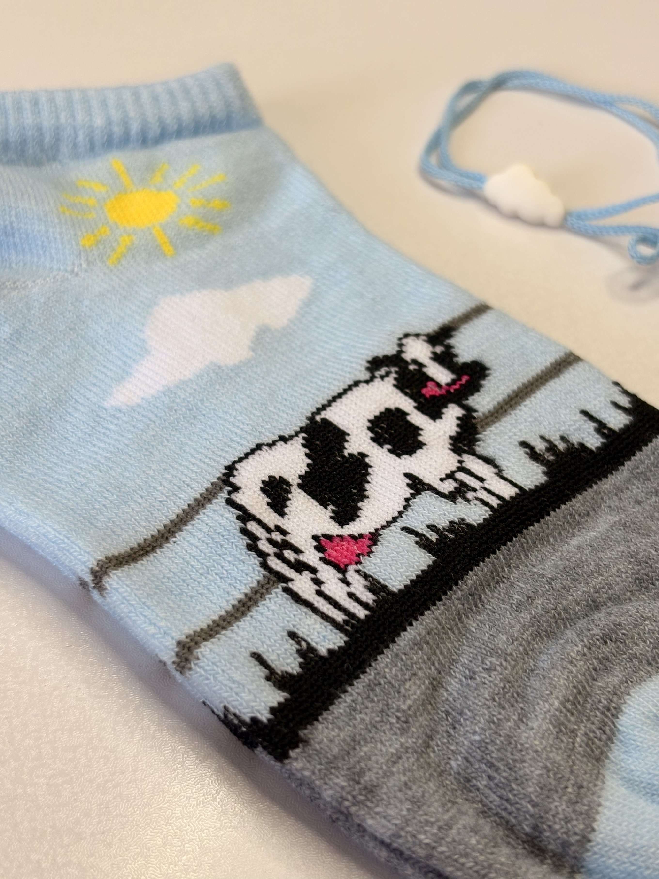 با این جورابهای شاد و تابستانی، مزرعهای پر از زندگی را به پاهایتان بیاورید! طراحی رنگارنگ شامل گاو سیاه و سفید خندان در حال چریدن، همراه با خورشید زرد درخشان، ابر پفکی و علفزار سبز، روی زمینه آبی آسمانی، حس یک روز آفتابی روستایی را القا میکند. جنس نرم و سبک پنبهای (۷۰% پنبه، ۳۰% الاستین)، ایدهآل برای روزهای گرم، بازی کودکان یا استایلهای کژوال خانوادگی. سایز استاندارد (۳۴-۳۹)، قابل شستشو در ماشین و مقاوم در برابر رنگپریدگی. همراه با دستبند آبی با آویز ابر و مهره فیروزهای، و مجسمه گاو کوچک با جعبه طلایی، این ست هدیهای دلپذیر برای بچهها و عاشقان طبیعت است – هر قدم، ماجرایی از مزرعه شاد را روایت میکند!