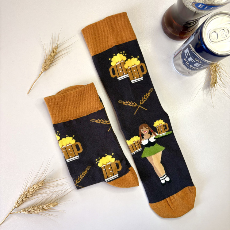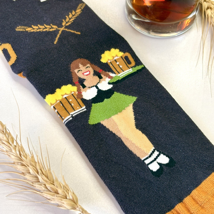 با این جورابهای شاد و سنتی، حس فستیوال اکتبرفست را به هر قدمی اضافه کنید! طراحی بامزه شامل زن باواریایی با موهای قهوهای، لبخند درخشان و لباس سبز-سفید، در حال حمل سینی پر از لیوانهای کفآلود آبجو طلایی، همراه با المانهای گندم و نمادهای جشن، روی زمینه مشکی کلاسیک با لبههای نارنجی، نمادی از شادی مونیخ و فرهنگ آلمانی است – ایدهآل برای جشن اکتبرفست ۲۰۲۵، مهمانیهای دوستانه یا استایلهای کژوال پاییزی. جنس نرم و مقاوم پنبهای (۷۰% پنبه، ۳۰% الاستین)، سایز استاندارد (۳۷-۴۳)، قابل شستشو در ماشین و حفظ رنگهای زنده. همراه با دکور لیوان و قوطی آبجو، و خوشههای گندم، این جفت هدیهای عالی برای عاشقان فستیوال و نوشیدنیهای کفدار است – چون اکتبرفست فقط یک جشن نیست، یک سبک زندگی است!