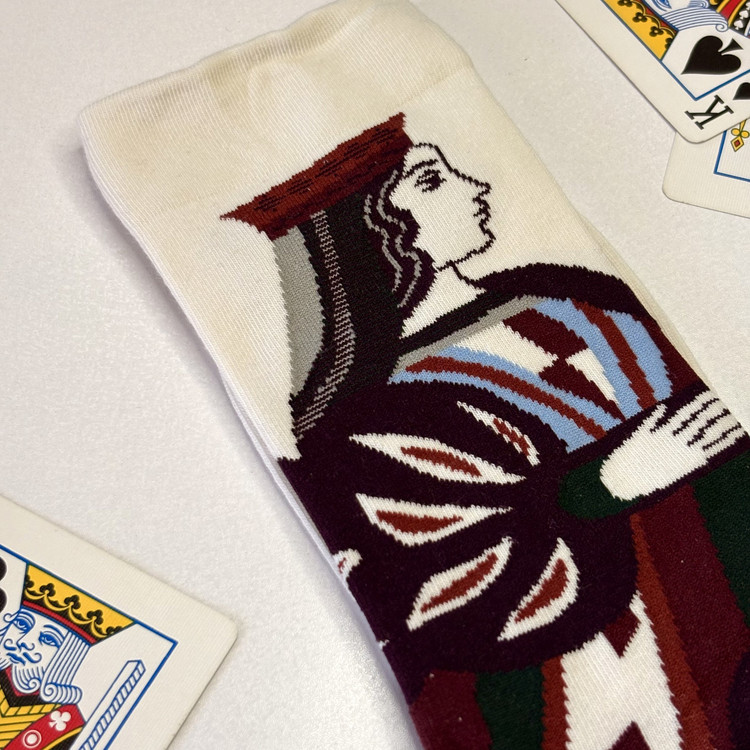 با این جورابهای کلاسیک و الهامگرفته از ورقبازی، حس هیجان کازینو را به پاهایتان ببخشید! طراحی دقیق شامل بی بی قلب با تاج قرمز و لباس بنفش-سبز، در حال دست دادن با شاه پیک با ریش و تاج طلایی، روی زمینه سفید خامهای با لبههای سبز، همراه با کارتهای پراکنده مثل آس پیک و بی بی گشنیز، نمادی از استراتژی و سرگرمی است. جنس نرم و مقاوم پنبهای (۷۵% پنبه، ۲۵% الاستین)، ایدهآل برای شبهای بازی، مهمانیهای دوستانه یا استایلهای کژوال. سایز استاندارد (۳۶-۴۲)، قابل شستشو در ماشین و حفظ جزئیات رنگی. همراه با کارتهای واقعی ورق، این جفت هدیهای عالی برای عاشقان پوکر و ورق باز ها است – هر قدم، یک دست برنده!