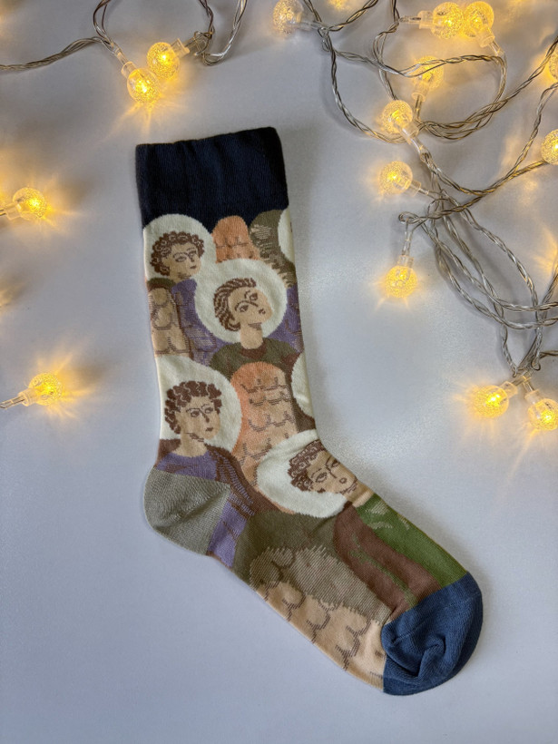 جورابهای یونیسکس با طرح آیکونهای مقدس الهامگرفته از هنر بیزانسی، چهرههای قدیسان با هالههای طلایی، موهای فرفری و ردایهای رنگارنگ بنفش، سبز و بژ را به نمایش میگذارد، نمادی از ایمان و زیبایی معنوی. بافت پنبهای نرم و تنفسپذیر، رطوبت را جذب کرده و پاها را در طول روز راحت نگه میدارد، ایدهآل برای استایلهای هنری زمستانی یا هدیهای الهامبخش به عاشقان هنر. حاشیههای تیره کلاسیک و دوام بالا با تقویت پاشنه و پنجه، همراه با جو festive چراغهای رنگی، جلوهای جادویی و فرهنگی به outfit شما میبخشد. با این جورابها، هر قدم را به سفری در تاریخ مقدس تبدیل کنید و گرمای ایمان را در زمستان حس کنید!